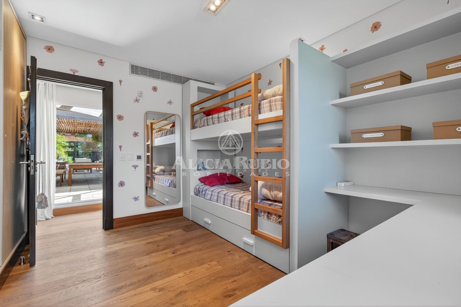 Puerta de acceso a parte íntima. Placares en el pasillo para la ropa blanca y ventanal con salida al JARDIN.