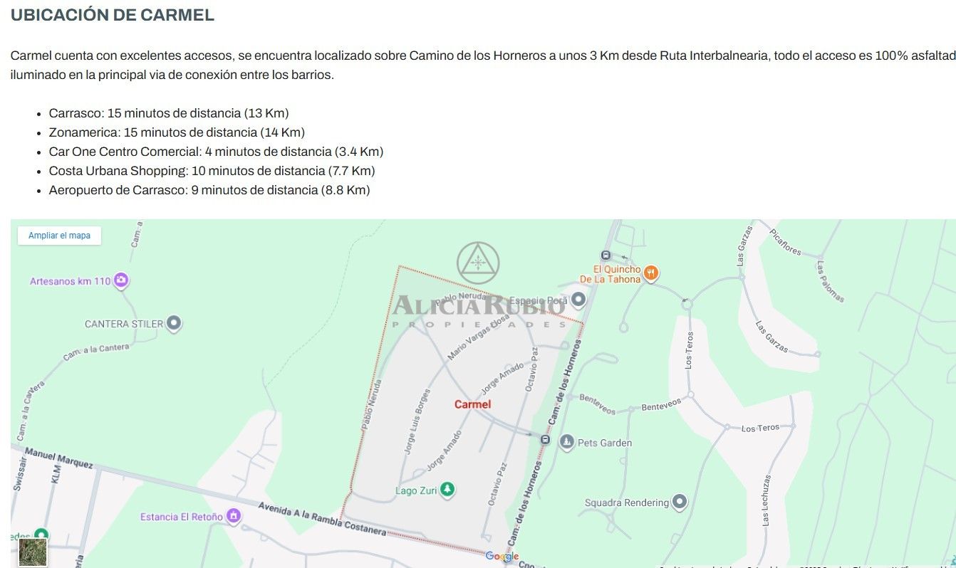 BARRIO CARMEL, a 15 minutos de Carrasco (13 Km), 15 minutos de Zonamerica ( 14 Km), camino 100% asfaltado e iluminado. Dentro de los servicios comunes el barrio cuenta con club house, canchas deportivas, gimnasio, seguridad y portería las 24 horas, barbacoa, kids house, playroom, parque infantil, vestuarios, servicio de recolección de residuos, servicio privado de transporte hacia Montevideo, etc