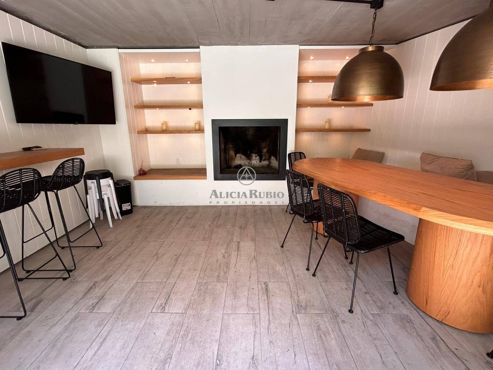 PATIO CON BARBACOA HECHO RECIENTENTE CON DECORADORA. Estufa leña, espacio para TV y Bar empotrado.